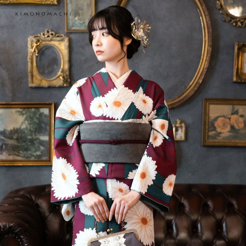 袷着物:細かな地模様のある生地。落ち着いた赤紫色の地に深い青緑の矢羽根、白に淡いベージュのぼかしの大小の菊の花。深い色合いとアンティーク調の大胆な柄行が魅力です。裏地は浅いターコイズ。