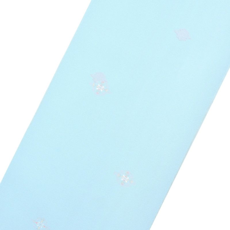 ややグレイッシュな明るい薄青色の地。細かな網目のような地模様のある生地です。唐花や鹿の子を組み合わせた松皮紋が、間隔を開けて表現されています。淡いベージュに白、薄黄色、桃色など。