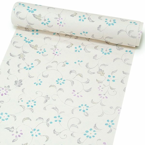 【カラー】生成り色地に花更紗模様。グレー、薄緑の葉に、浅い青色、紫色のお花のシンプルな色使いですが、地味にならず、すっきりとした綺麗な雰囲気。