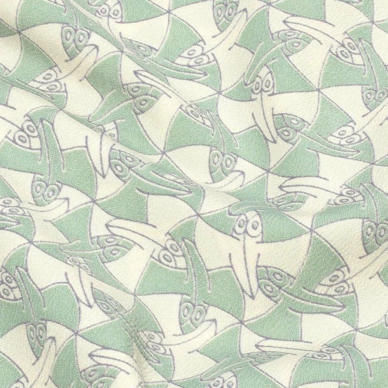 【色柄】錆青磁色とオフホワイトに青灰色の輪郭線で、戯画化された飛び魚のような千鳥のような文様が互い違いに表現されています。個性的でユーモラスな小紋です。