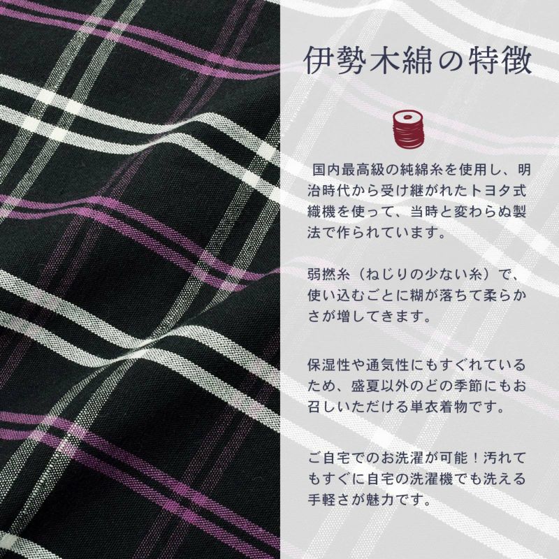着物は単衣(ひとえ)仕立てですが、伊勢木綿は保湿・通気性にも優れているので、盛夏や真冬を除いて通年ご着用いただけます。