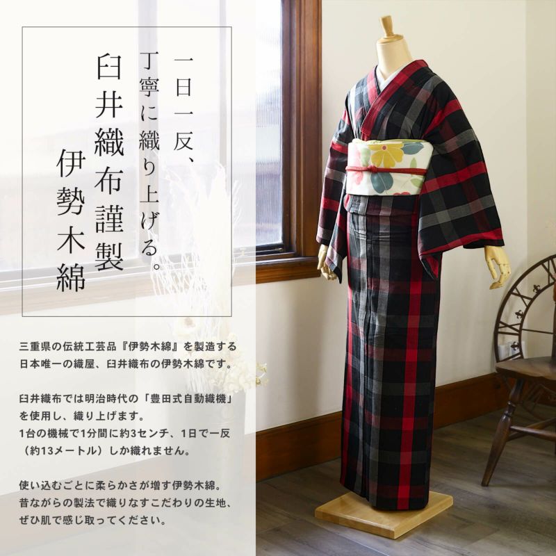 伊勢木綿 洗える着物 単品「格子黒×赤」お仕立て上がり 木綿きもの 日本製 三重県 伝統工芸品 単衣 綿 カジュアル チェック 小紋 レディース キモノ kimono