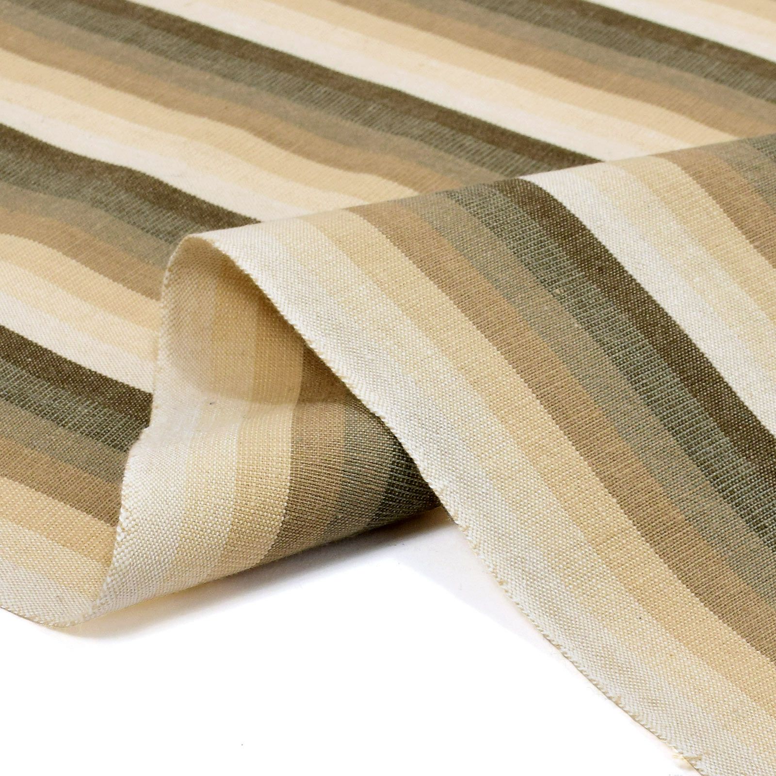 【色柄】灰みの茶、利休色、白茶、砂色、ベージュの棒縞がグラデーションとなるように配置された縦縞。シックな雰囲気のストライプです。