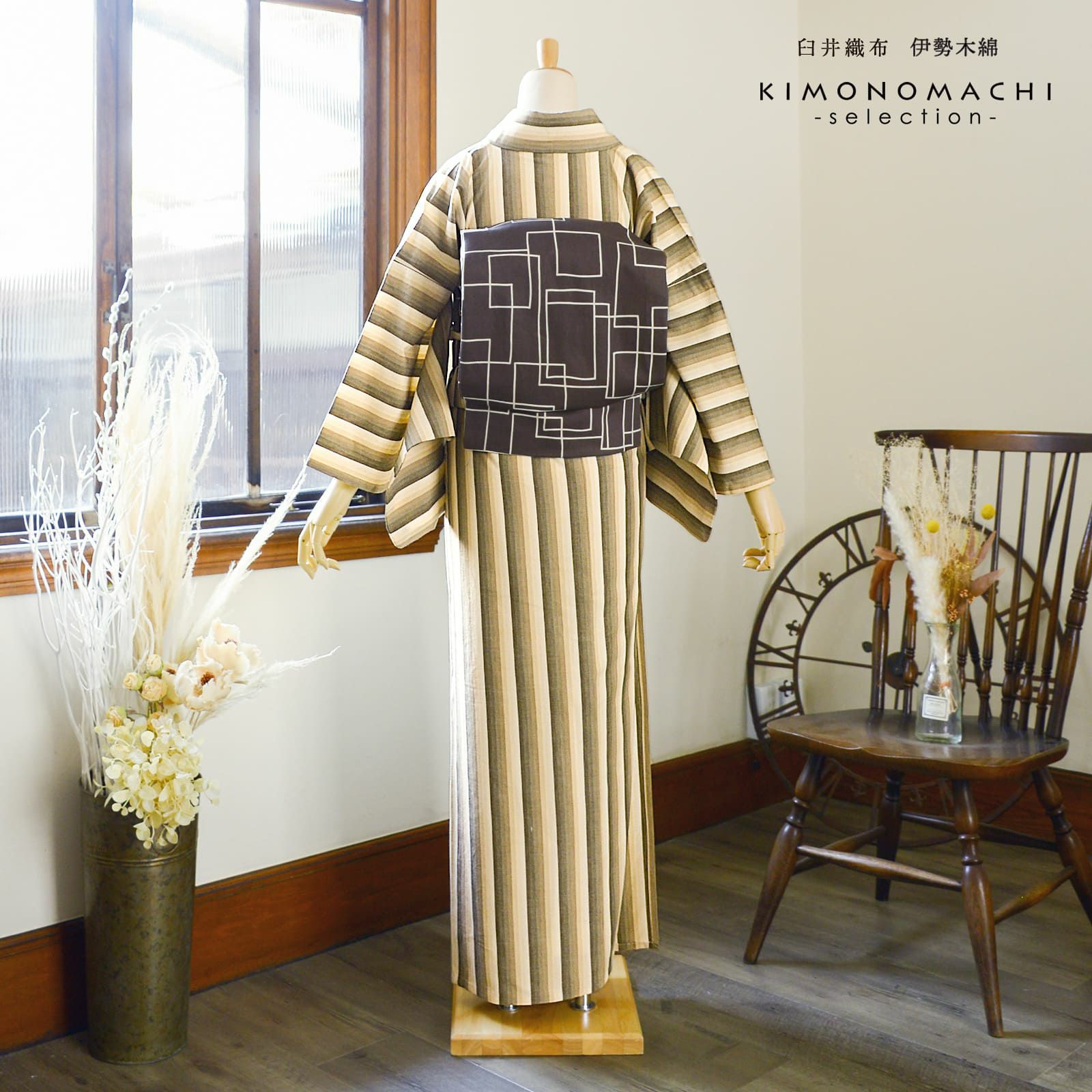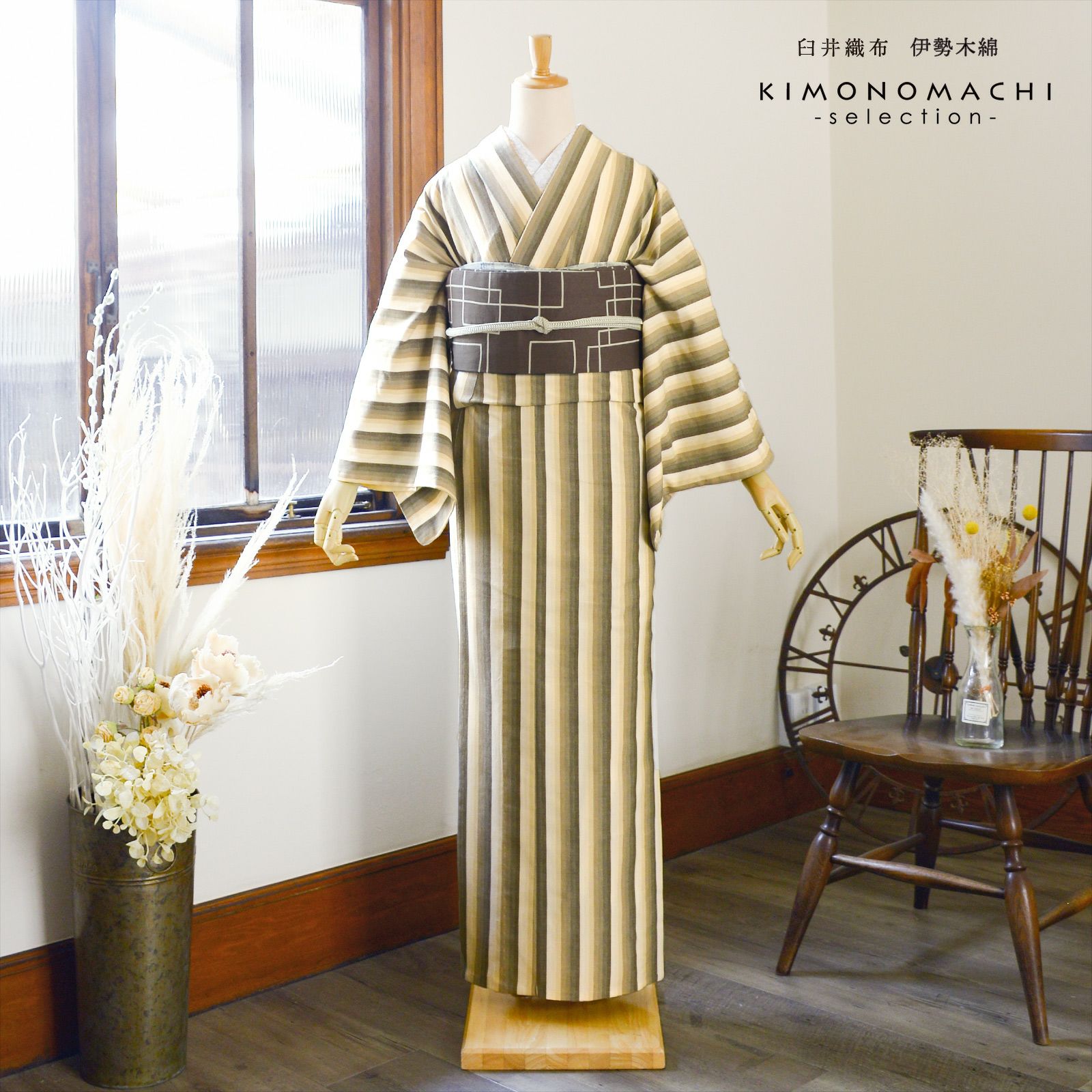やわらかく、どこかぬくもりが感じられる「伊勢木綿」のお仕立て上がり単衣着物 伊勢木綿 洗える着物 単品「かつお縞 サンドベージュ」お仕立て上がり 木綿きもの 日本製 三重県 伝統工芸品 単衣 綿 カジュアル チェック 小紋 レディース キモノ kimono【メール便不可】