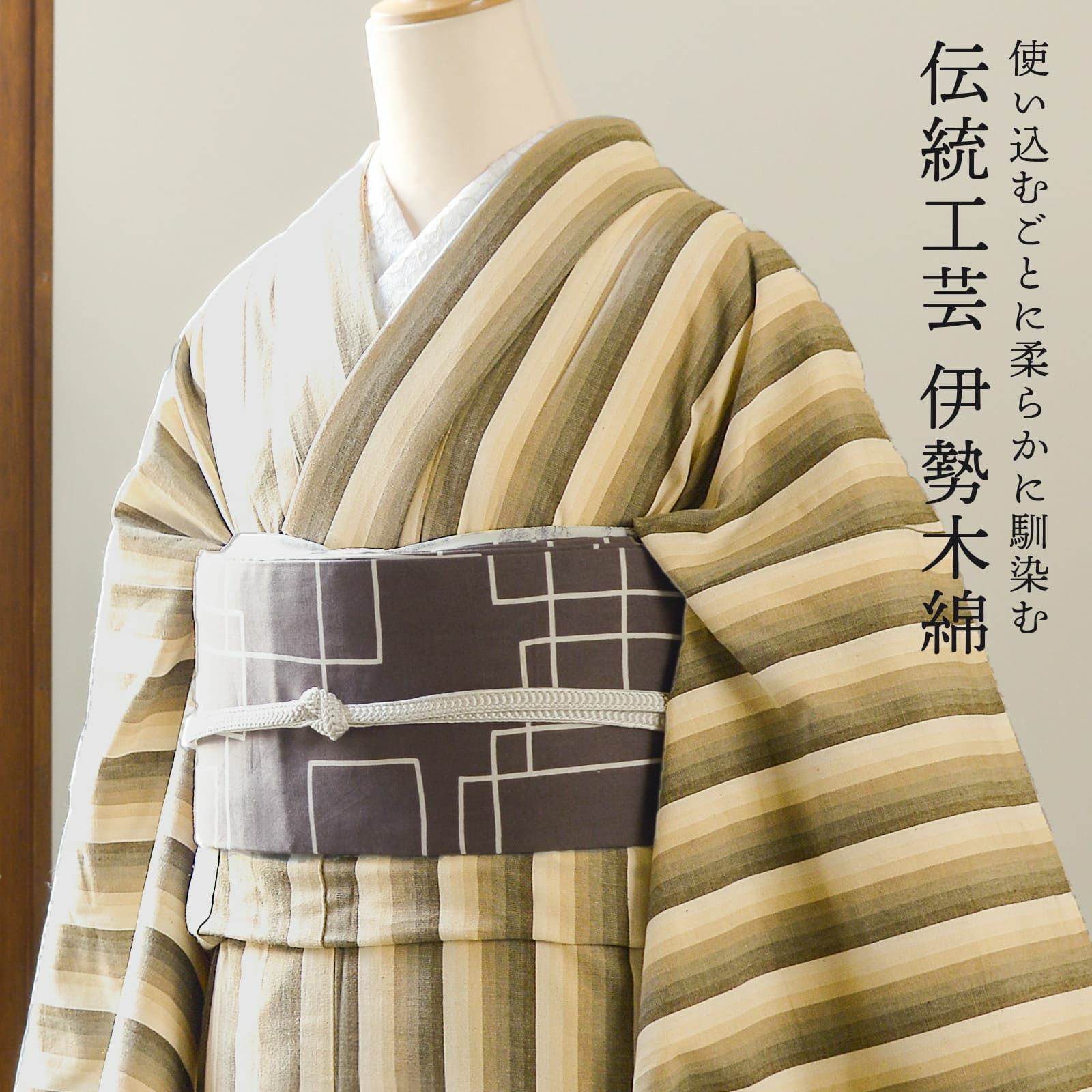 着物は単衣(ひとえ)仕立てですが、伊勢木綿は保湿・通気性にも優れているので、盛夏や真冬を除いて通年ご着用いただけます。