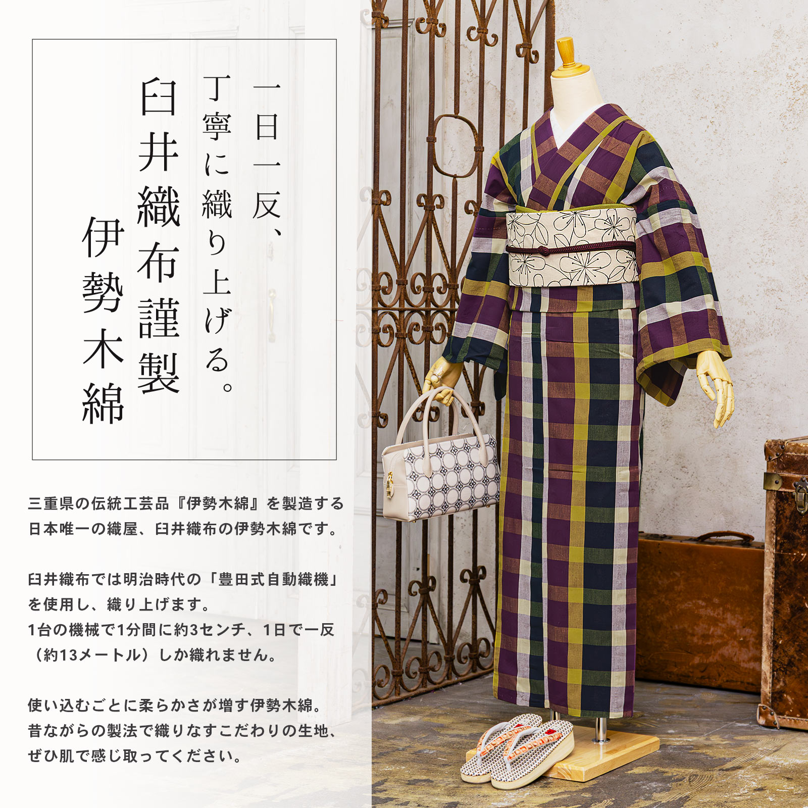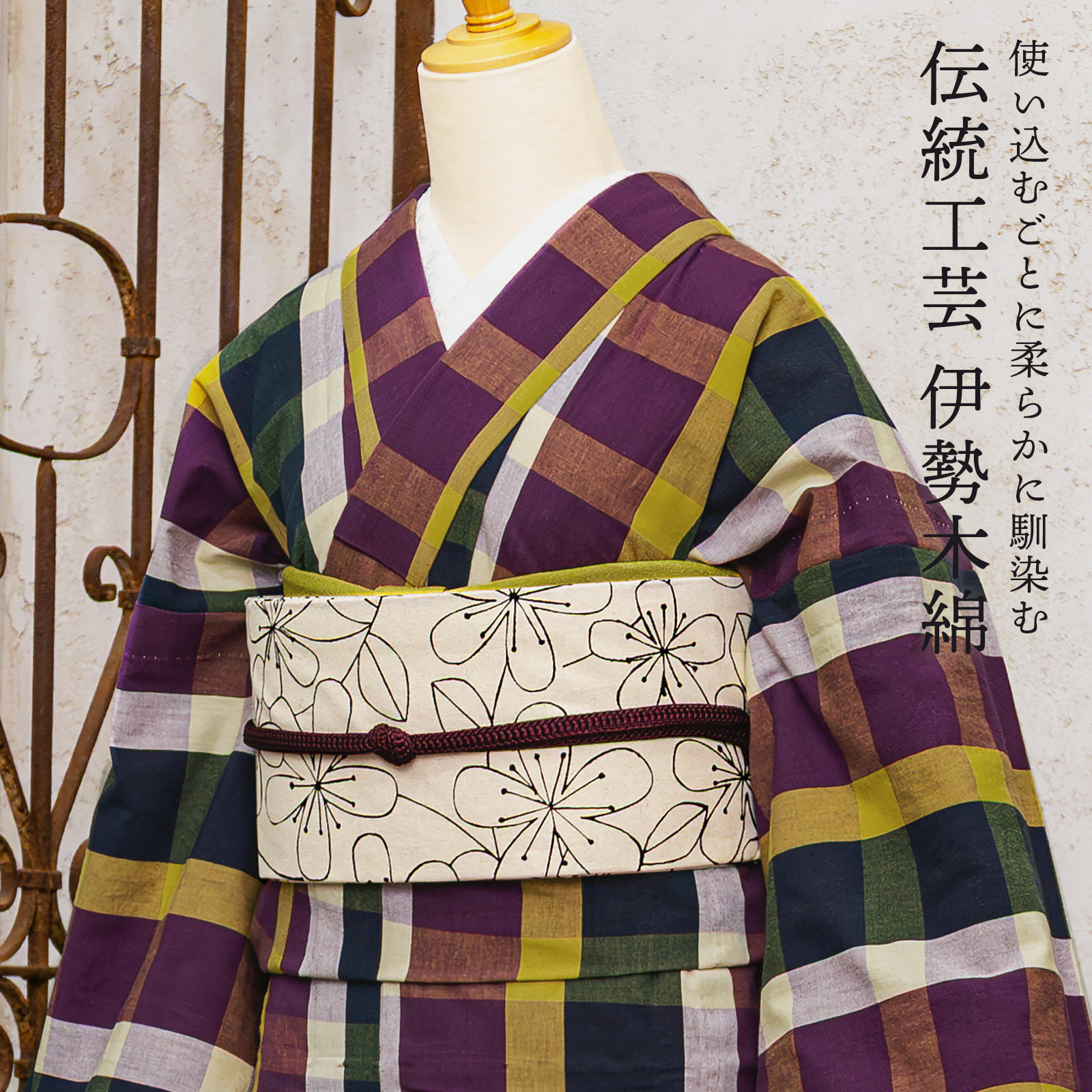 着物は単衣(ひとえ)仕立てですが、伊勢木綿は保湿・通気性にも優れているので、盛夏や真冬を除いて通年ご着用いただけます。