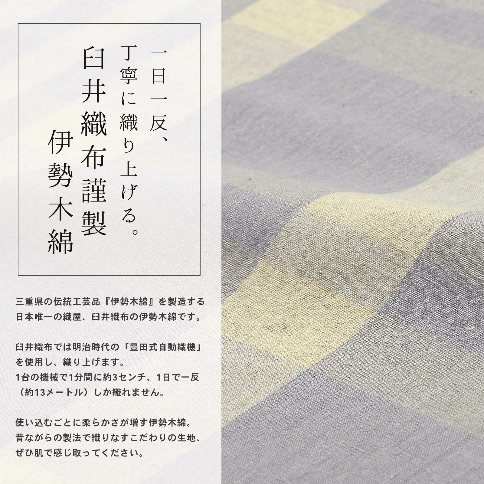 ゆっくりと時間をかけて丁寧に織り上げられた伊勢木綿の優しく素朴な風合いを、ぜひ肌で感じ取ってください
