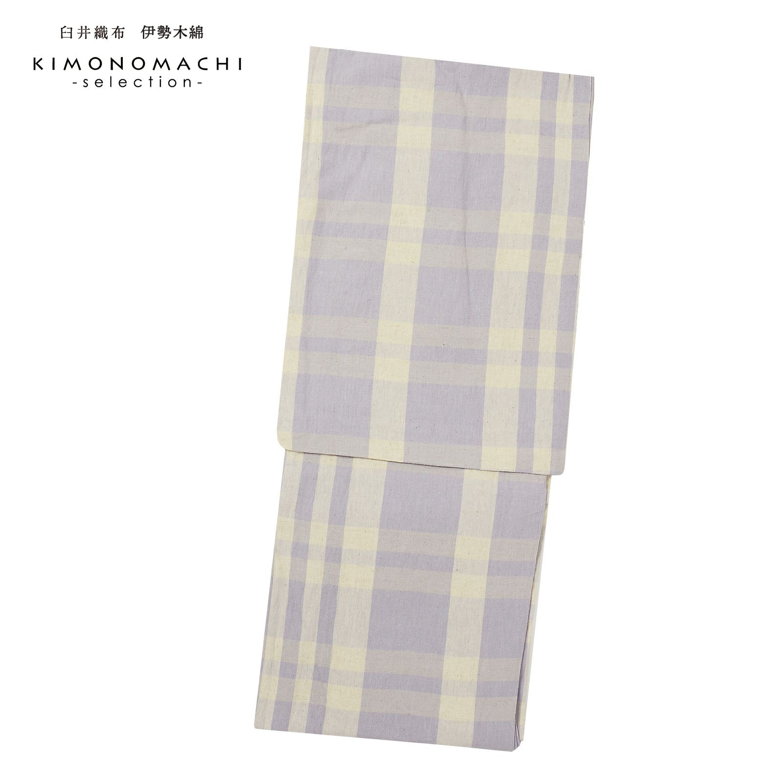 【色柄】生成り色がかった地に、浅い薄紫色のランダムな感覚の縞。横段に、横段に同色を重ねた格子。淡くグレイッシュな色合いが優しい印象の格子です。