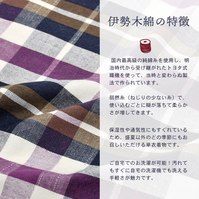 5. 伊勢木綿 洗える着物 単品 「重ね格子 白地、紫×紺茶」 お仕立て上がり 木綿きもの 日本製 三重県 伝統工芸品 単衣 綿 カジュアル チェック 小紋 レディース キモノ kimono 【メール便不可】