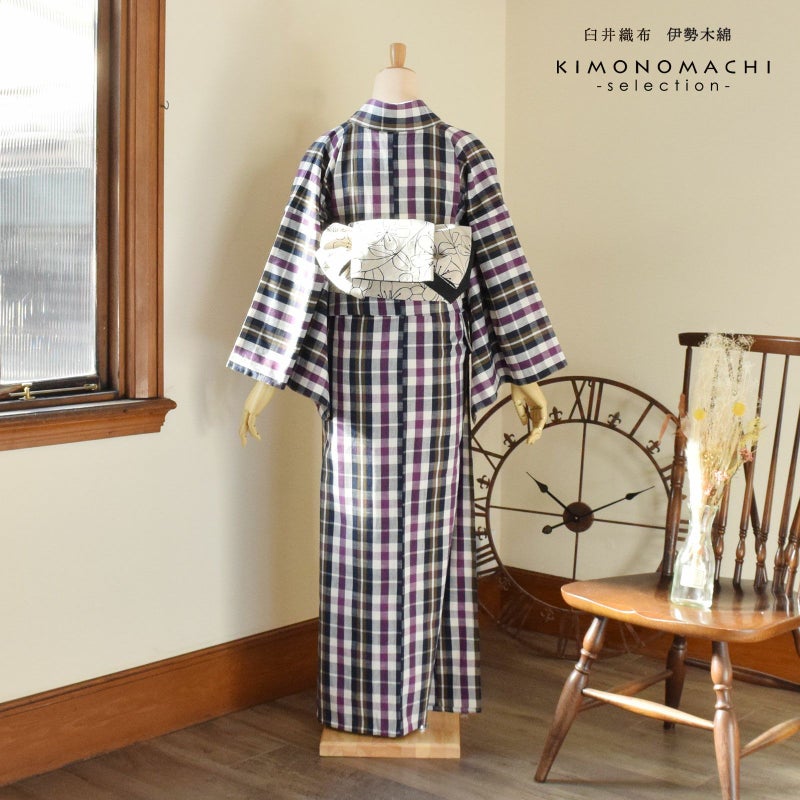 伊勢木綿 洗える着物 単品 「重ね格子 白地、紫×紺茶」 お仕立て上がり 木綿きもの 日本製 三重県 伝統工芸品 単衣 綿 カジュアル チェック 小紋 レディース キモノ kimono