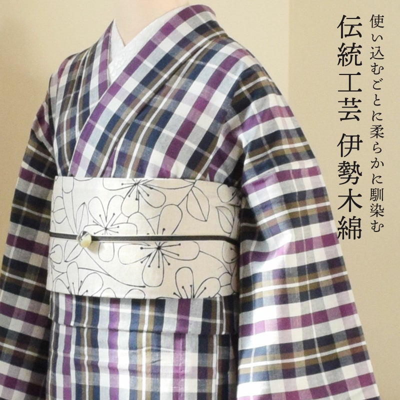 やわらかく、どこかぬくもりが感じられる「伊勢木綿」のお仕立て上がり単衣着物 伊勢木綿 洗える着物 単品 「重ね格子 白地、紫×紺茶」 お仕立て上がり 木綿きもの 日本製 三重県 伝統工芸品 単衣 綿 カジュアル チェック 小紋 レディース キモノ kimono 【メール便不可】