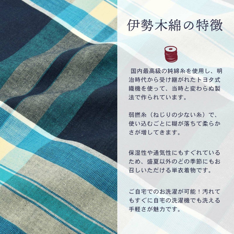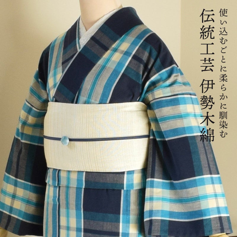 着物は単衣(ひとえ)仕立てですが、伊勢木綿は保湿・通気性にも優れているので、盛夏や真冬を除いて通年ご着用いただけます。