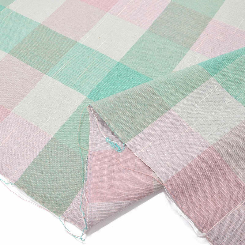 全体的に薄グレーの地に薄い淡紅藤色、淡いミント系の白藍色などを重ねた約4~5cm角ほどのブロックチェック。夢物語のようなファンタジックな格子です。