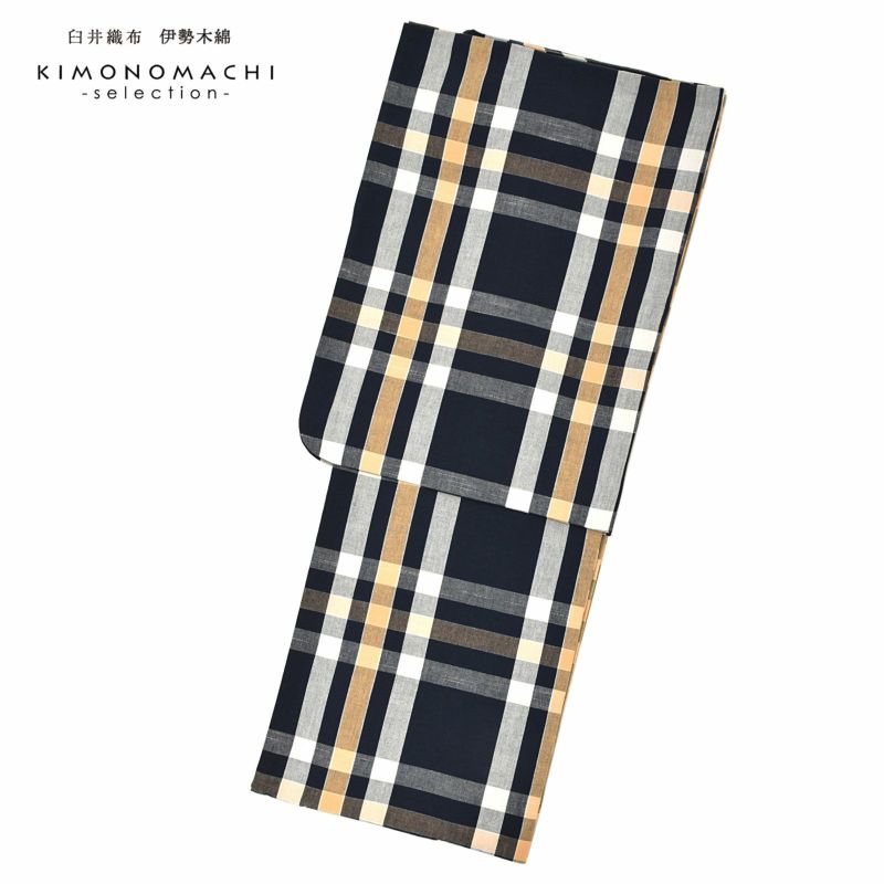 深い鉄紺に落ち着いた白、淡い橙色、横段に淡い色を重ねたチェック。紺の中の淡い橙色が窓から見る月明りを思わせる格子です。
