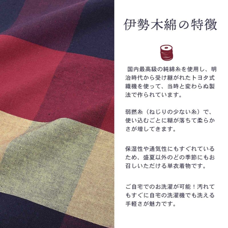 着物は単衣(ひとえ)仕立てですが、伊勢木綿は保湿・通気性にも優れているので、盛夏や真冬を除いて通年ご着用いただけます。