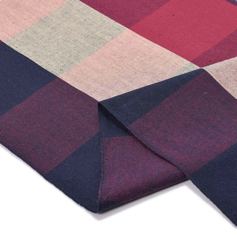 紫紺色、浅い生成り色、赤紫色、横段に薄い黒を重ねた約7cm弱ほどのブロックチェック。躑躅のような深い赤紫色系の格子です。