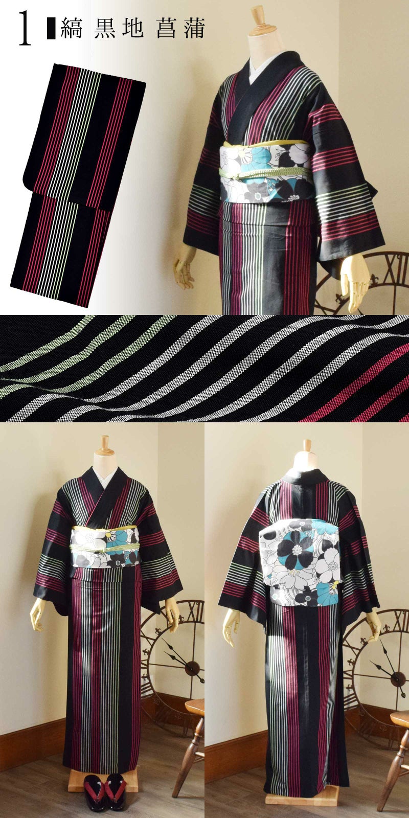 1縞 黒地、菖蒲…黒地に濃紅色、白、浅い黄緑色の細い棒縞。間隔をおいて濃紅色の棒縞。すっきりとした中に華やかさのある縞です。