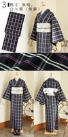3格子 黒地、白×紫(紫蘇)…黒を基調に細い紫、白、横段に淡い色を重ねたチェック。紫蘇と名付けられたキリッとした雰囲気の格子です。