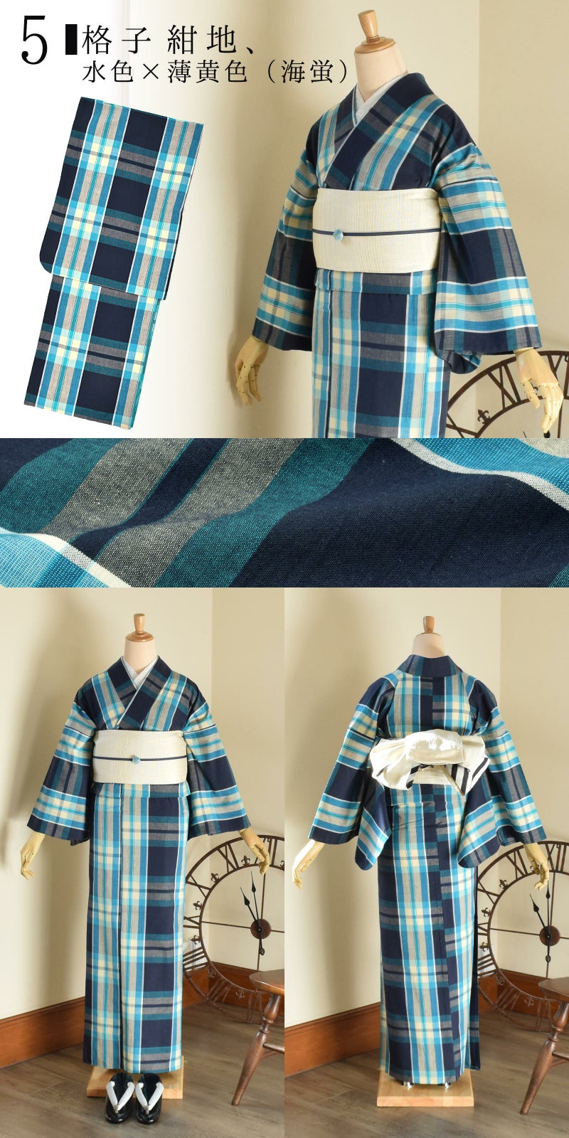 5格子 紺地、水色×薄黄色(海蛍)…深い紺に強い水色、淡い黄色、横段に淡い色を重ねたチェック。紺の中の薄黄色の交点が海蛍のようにほの明るく見える格子です。
