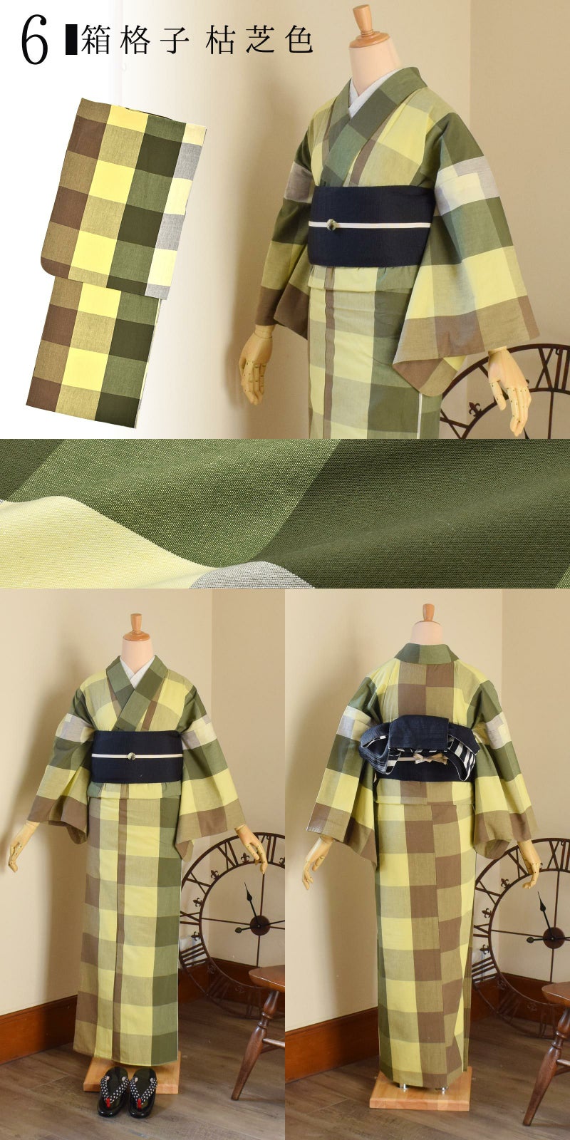 6箱格子 枯芝色…薄黄色、草色、浅いライム色、鈍い茶色、薄いグレーなどの約10cm角ほどのブロックチェック。草原を思わせる、落ち着いたカーキグリーン系の格子です。