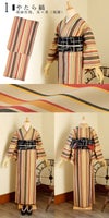 1やたら縞 亜麻色地、朱×茶(地層)…ベージュの地に黄みの茶色、朱色、黄土色に細い黄色のランダムな縦縞。地層という名前の暖かみを感じる縞です。