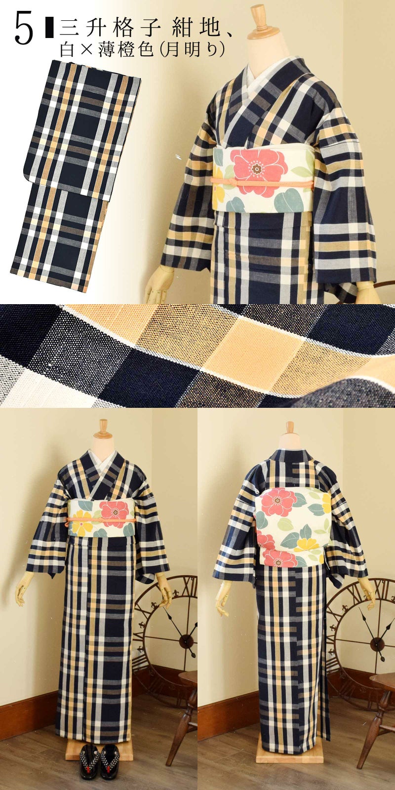 5三升格子 紺地、白×薄橙色(月明り)…深い鉄紺に落ち着いた白、淡い橙色、横段に淡い色を重ねたチェック。紺の中の淡い橙色が窓から見る月明りを思わせる格子です。