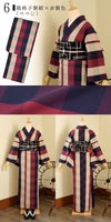 6箱格子 紫紺×赤紫色(つつじ)…紫紺色、浅い生成り色、赤紫色、横段に薄い黒を重ねた約7cm弱ほどのブロックチェック。躑躅のような深い赤紫色系の格子です。
