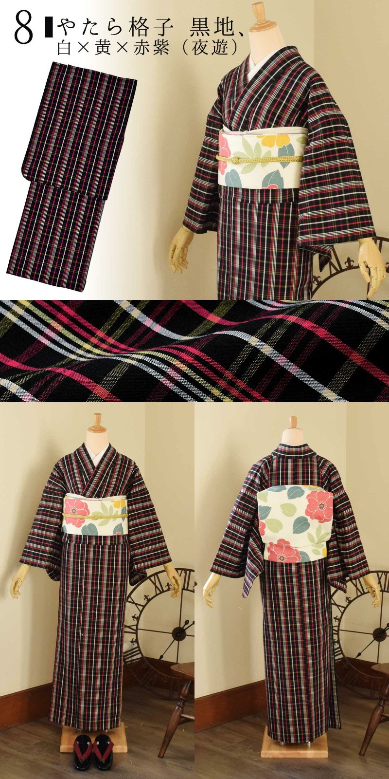 8やたら格子 黒地、白×黄×赤紫(夜遊)…黒を基調に細い白、黄、ピンクみの赤紫、横段に淡い黄、赤紫を重ねたチェック。夜遊と名付けられた遊び心を感じるランダムな格子です。