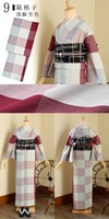 9箱格子 浅蘇芳色…グレイッシュな深い赤紫色、淡い青灰色、白藍色などの約14cm角ほどのブロックチェック。全体的にグレイッシュな爽やかさのある格子です。