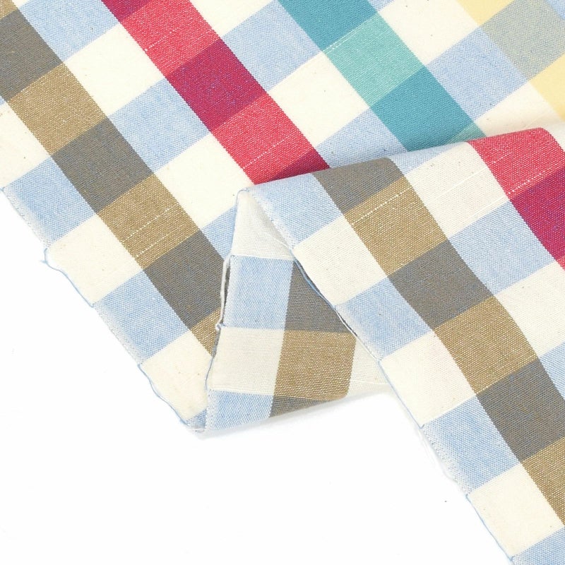 オフホワイトの地に薄い水色、白茶に赤紫、ミントグリーン、青、ピンクなど約2cm強の同じ太さの縞を重ねた格子。色とりどりの明るく可愛らしい格子です。