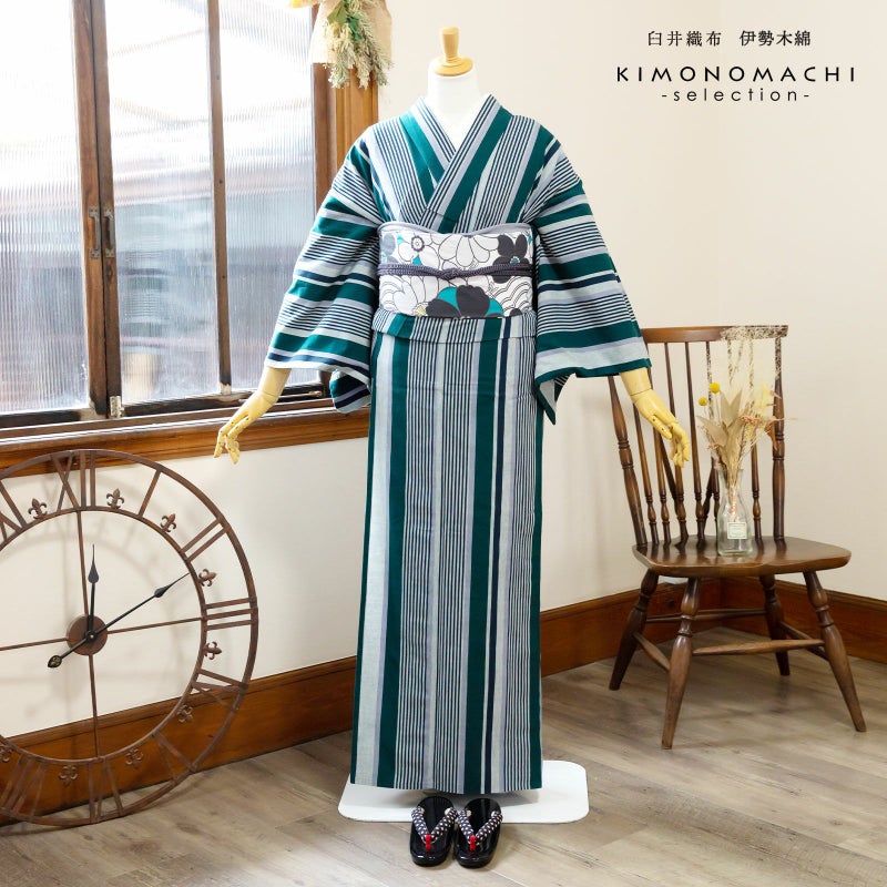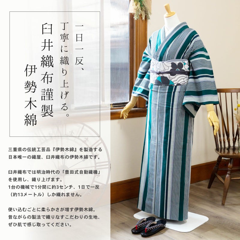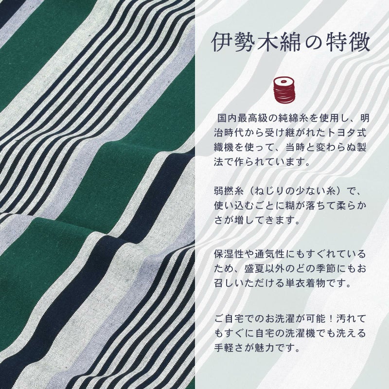 着物は単衣(ひとえ)仕立てですが、伊勢木綿は保湿・通気性にも優れているので、盛夏や真冬を除いて通年ご着用いただけます。