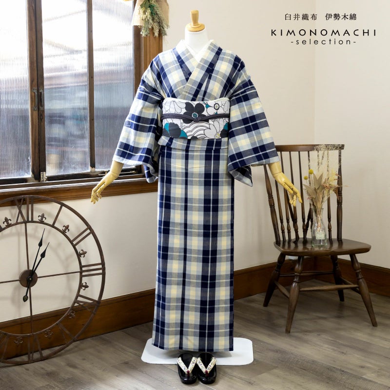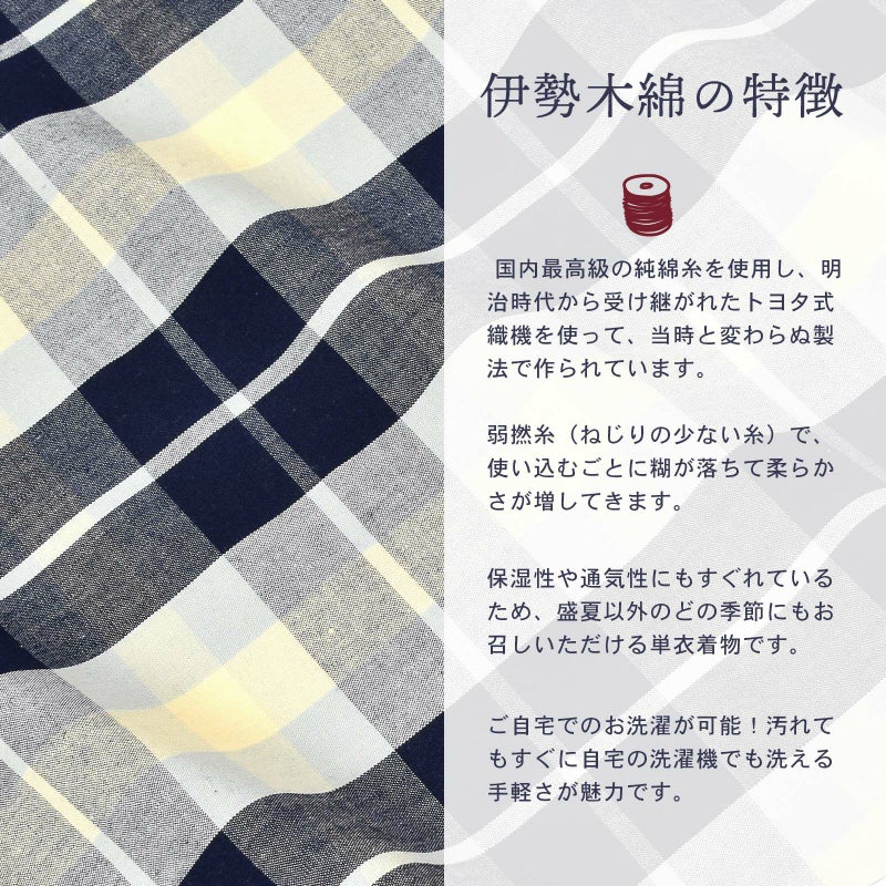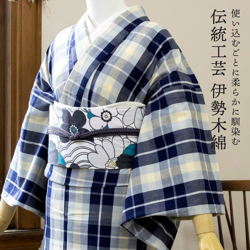 着物は単衣(ひとえ)仕立てですが、伊勢木綿は保湿・通気性にも優れているので、盛夏や真冬を除いて通年ご着用いただけます。