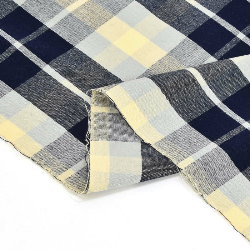 淡いブルーグレーに紺色、淡い黄色、横段に淡い色を重ねたチェック。淡くさわやかな色に紺が映える格子です。