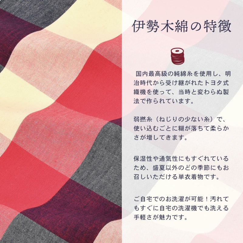 着物は単衣(ひとえ)仕立てですが、伊勢木綿は保湿・通気性にも優れているので、盛夏や真冬を除いて通年ご着用いただけます。