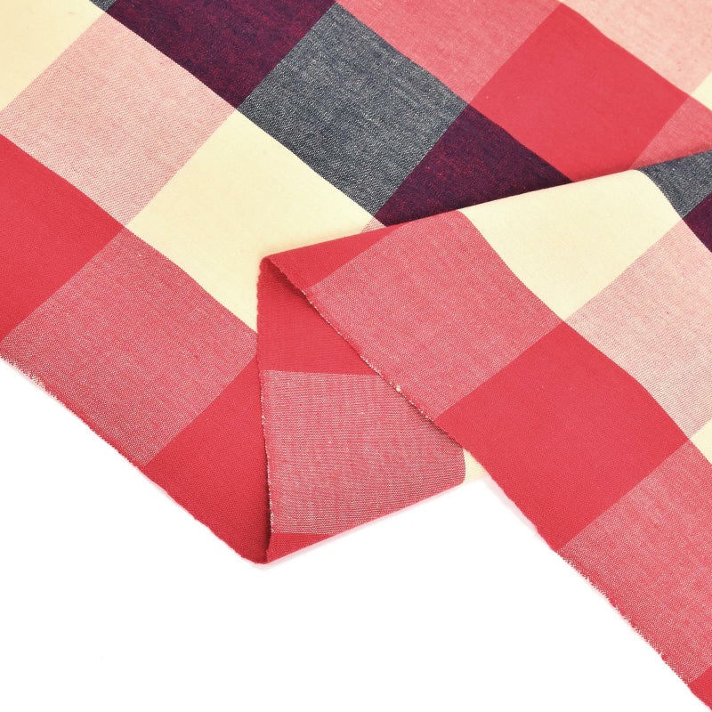 全体的に生成り色の地、ピンクみの赤紫色、浅い紺などを重ねた約6~7cm角ほどのブロックチェック。秋雨の景色のようなしっとりと深い色の格子です。