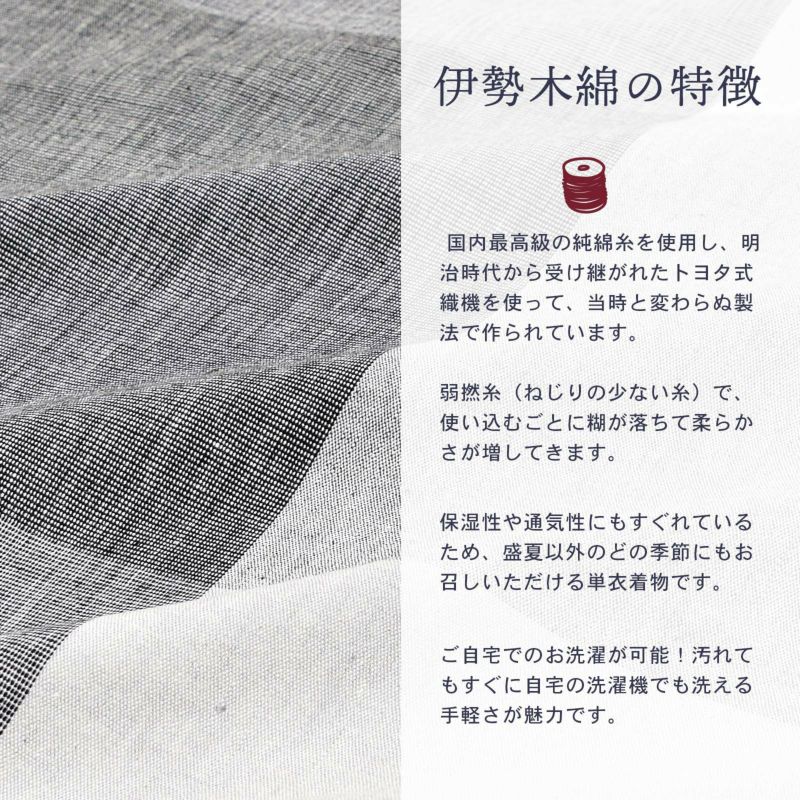 着物は単衣(ひとえ)仕立てですが、伊勢木綿は保湿・通気性にも優れているので、盛夏や真冬を除いて通年ご着用いただけます。