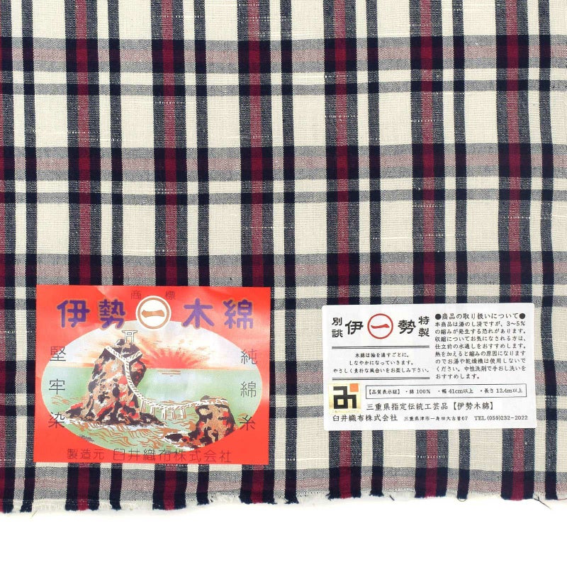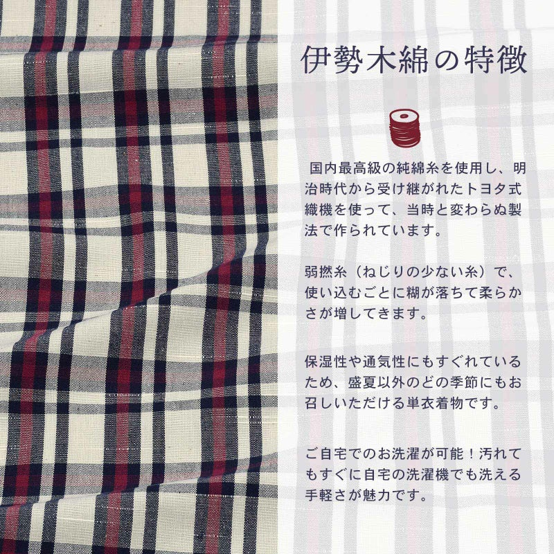 伊勢木綿 洗える着物 単品「重ね格子 白地、紺×紅色」お仕立て上がり 木綿きもの 日本製 三重県 伝統工芸品 単衣 綿 カジュアル チェック 小紋 レディース キモノ kimono