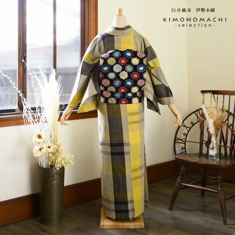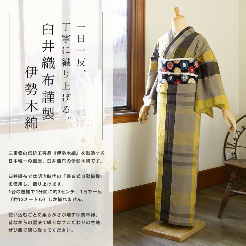伊勢木綿 洗える着物 単品「格子淡黄×グレー×墨色」お仕立て上がり 木綿きもの 日本製 三重県 伝統工芸品 単衣 綿 カジュアル チェック 小紋 レディース キモノ kimono