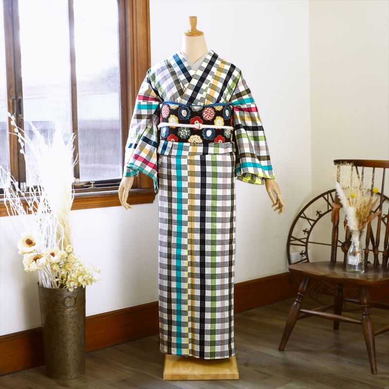 5. 伊勢木綿 洗える着物 単品「重ね格子黒×カラフルチェック」お仕立て上がり 木綿きもの 日本製 三重県 伝統工芸品 単衣 綿 カジュアル チェック 小紋 レディース キモノ kimono【メール便不可】