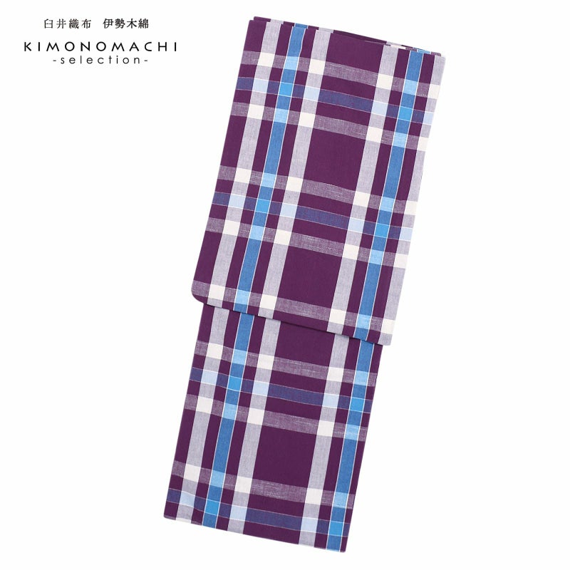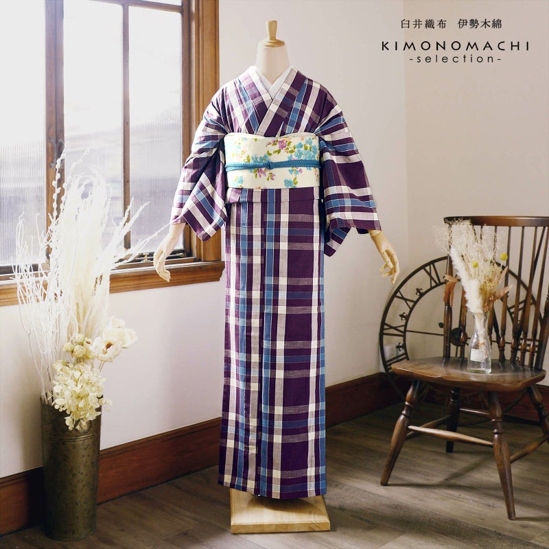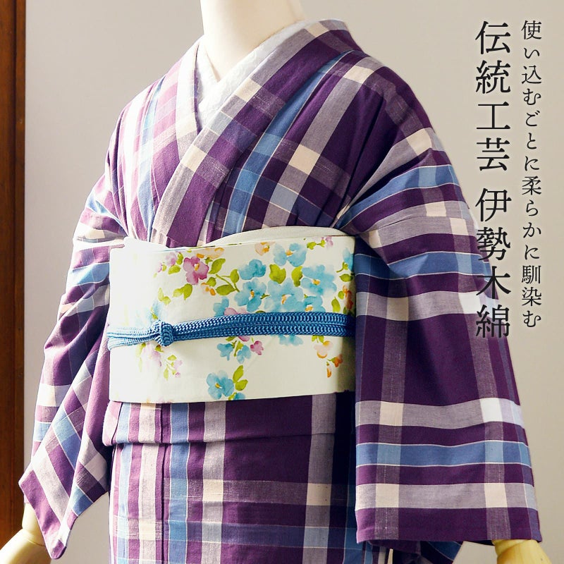 伊勢木綿 洗える着物 単品「格子 古代紫、白×水色」お仕立て上がり 木綿きもの 日本製 三重県 伝統工芸品 単衣 綿 カジュアル チェック 小紋 レディース キモノ kimono