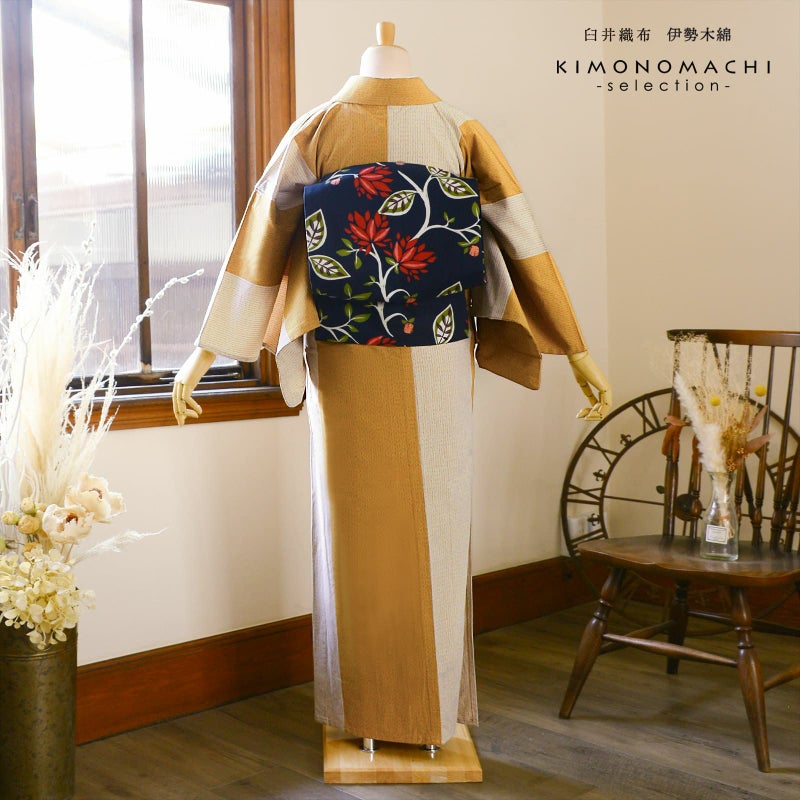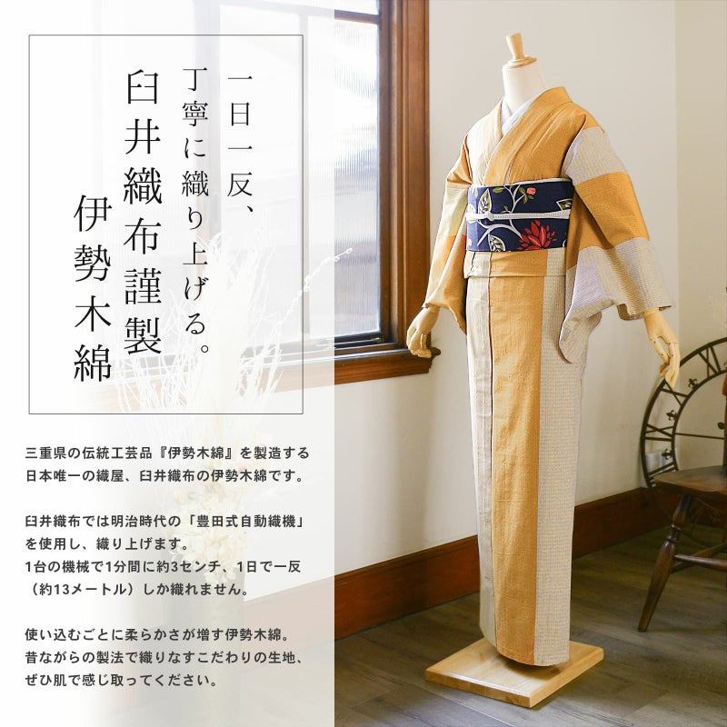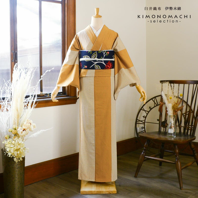 伊勢木綿 洗える着物 単品「縦縞 山吹茶×薄白」お仕立て上がり 木綿きもの 日本製 三重県 伝統工芸品 単衣 綿 カジュアル チェック 小紋 レディース キモノ kimono