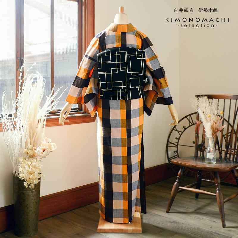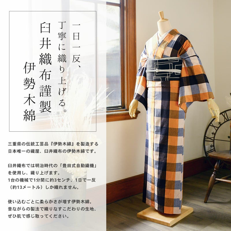 伊勢木綿 洗える着物 単品「六升格子 紺×橙」お仕立て上がり 木綿きもの 日本製 三重県 伝統工芸品 単衣 綿 カジュアル チェック 小紋 レディース キモノ kimono