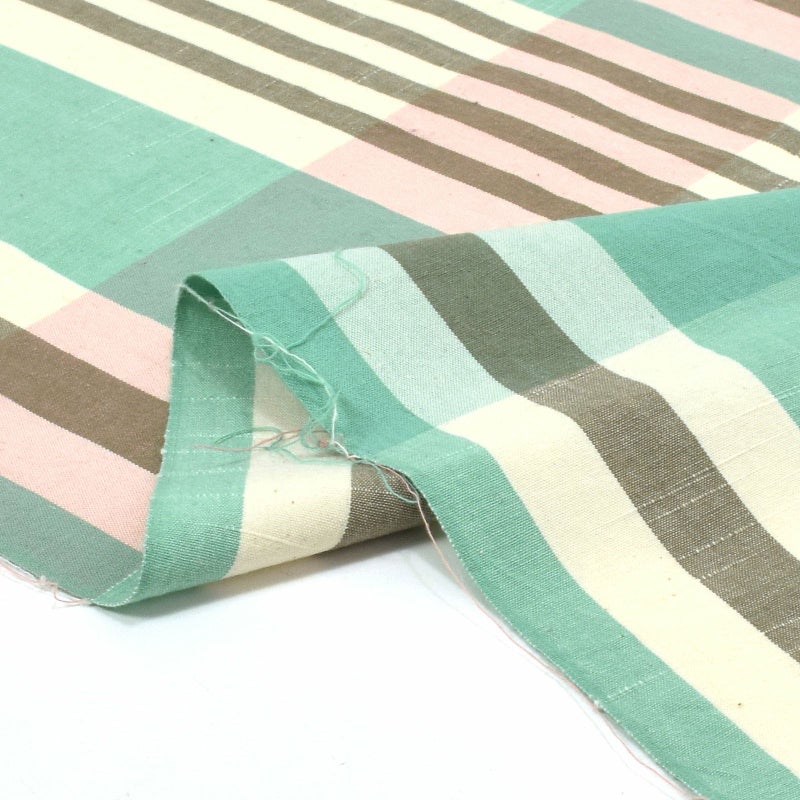 【色柄】白地に、カーキグレーのランダムな棒縞、ミントグリーンの縞。横段に、淡いミントグリーンとごく淡い薄紅色。爽やかな中に個性がある格子です。
