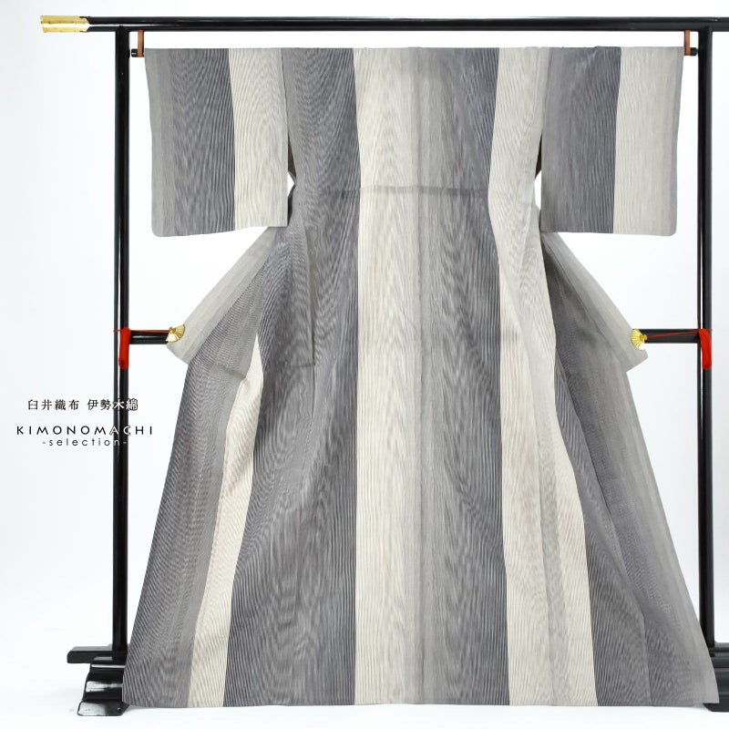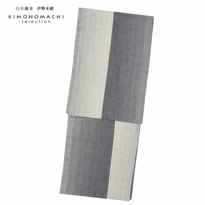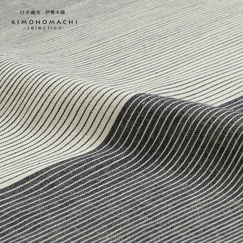 【色柄】地の2分の1強は浅い黒に生成り色の細かな滝縞、残りは生成り色の地に浅い黒の細かな滝縞。大きな割付けと太さの異なる縞のグラデーションが粋な印象に。