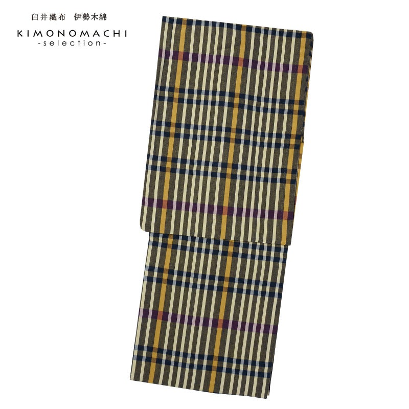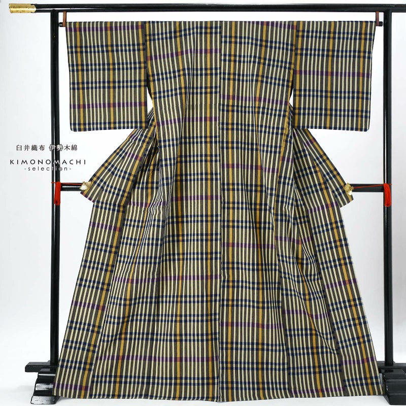 やわらかく、どこかぬくもりが感じられる「伊勢木綿」のお仕立て上がり単衣着物 伊勢木綿 洗える着物 単品「長格子 青朽葉地 黄色×紺×紫」お仕立て上がり 木綿きもの 日本製 三重県 伝統工芸品 単衣 綿 カジュアル チェック 小紋 レディース キモノ kimono【メール便不可】