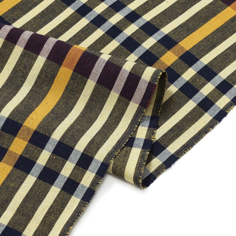 【色柄】経糸に紺、緯糸に浅い黄色を合わせた杢調の地に白、黄の縞。横段に紺の二本筋と紫を組み合わせた縦長の格子。個性的な配色で、長めの間隔の格子が格好いいデザインです。
