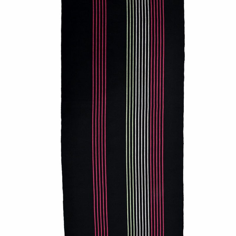 黒地に濃紅色、白、浅い黄緑色の細い棒縞。間隔をおいて濃紅色の棒縞。すっきりとした中に華やかさのある縞です。