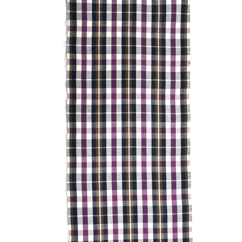 白を基調に紫、紺、茶、横段に淡い紫とグレーを重ねたチェック。モダンな雰囲気の格子です。