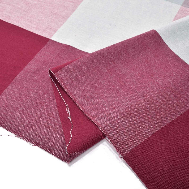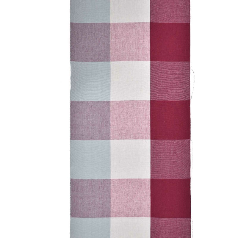 グレイッシュな深い赤紫色、淡い青灰色、白藍色などの約14cm角ほどのブロックチェック。全体的にグレイッシュな爽やかさのある格子です。
