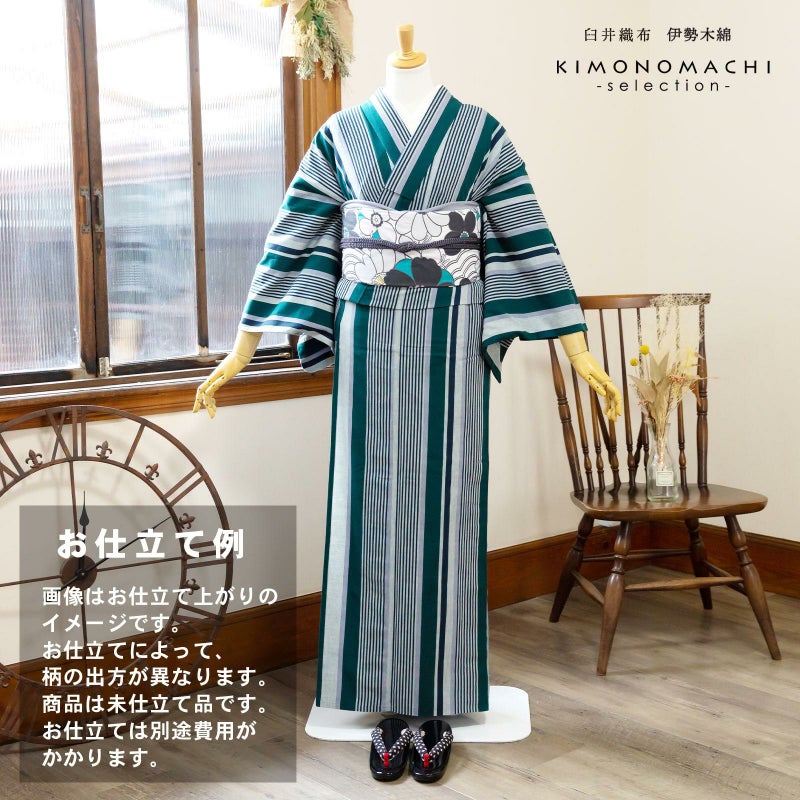 伊勢木綿 洗える着物 反物 「縞 深緑色×灰色」 未仕立て 木綿きもの 日本製 三重県 伝統工芸品 単衣 綿 カジュアル ストライプ 小紋 レディース キモノ kimono